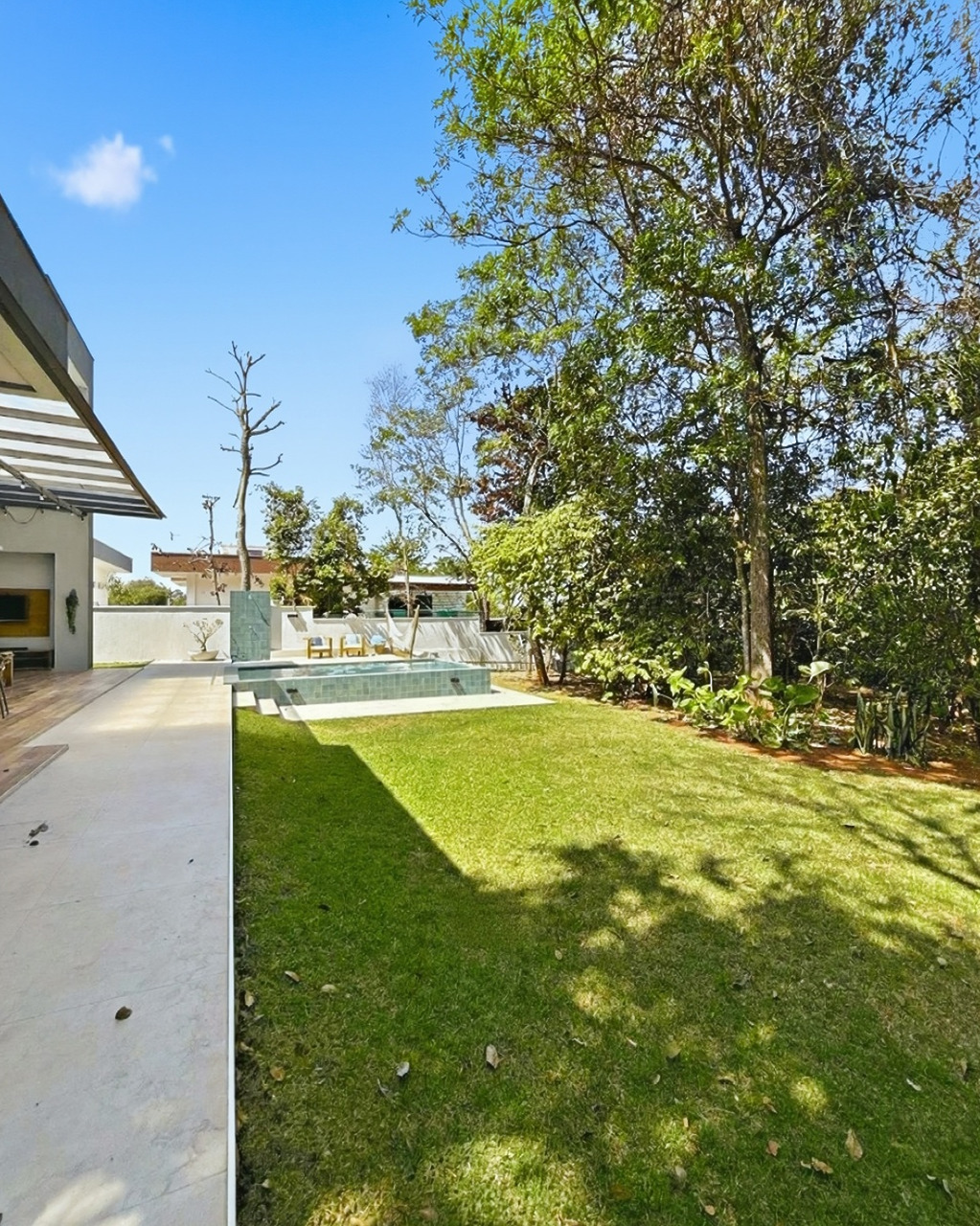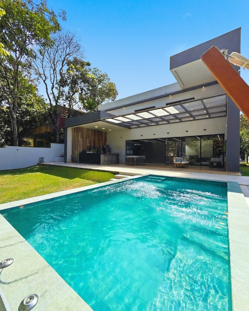 A área externa aproveita a topografia do lote de 1.000m² para oferecer um jardim maduro e privativo. A piscina aquecida permite uso durante todo o ano, situada ao lado de uma varanda coberta que funciona como extensão da sala.