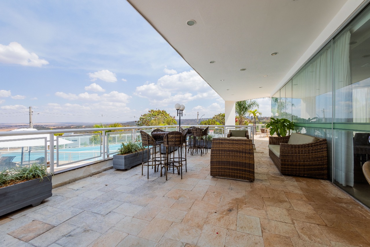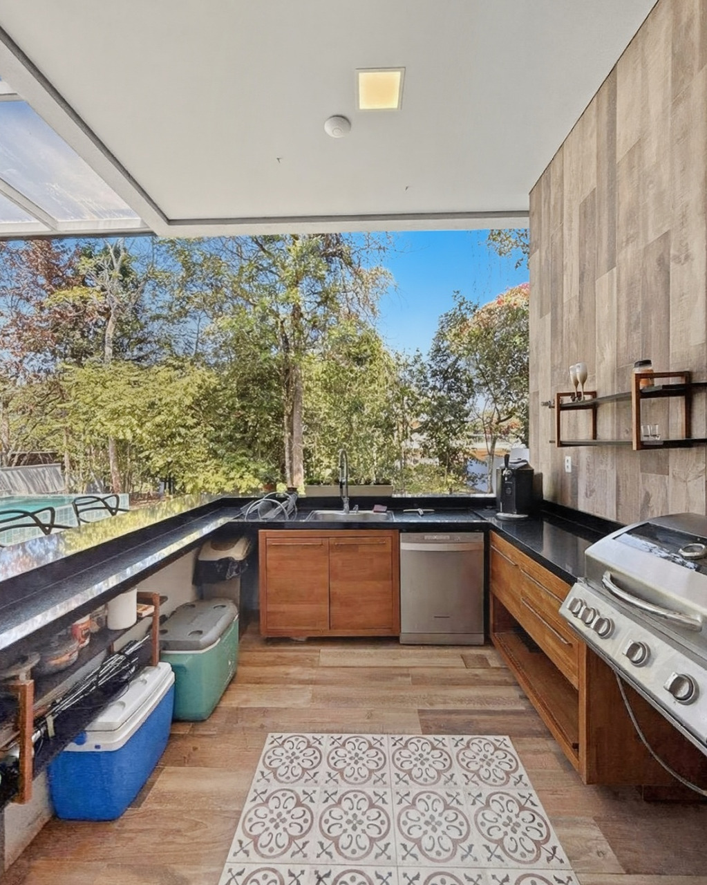 Conta com churrasqueira e bancada de apoio completa, ideal para almoços de fim de semana com vista para a piscina.