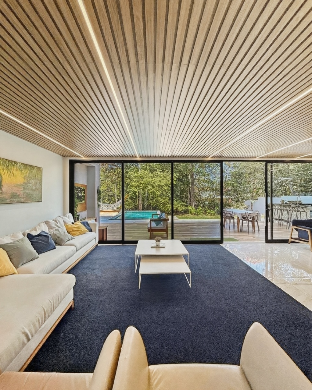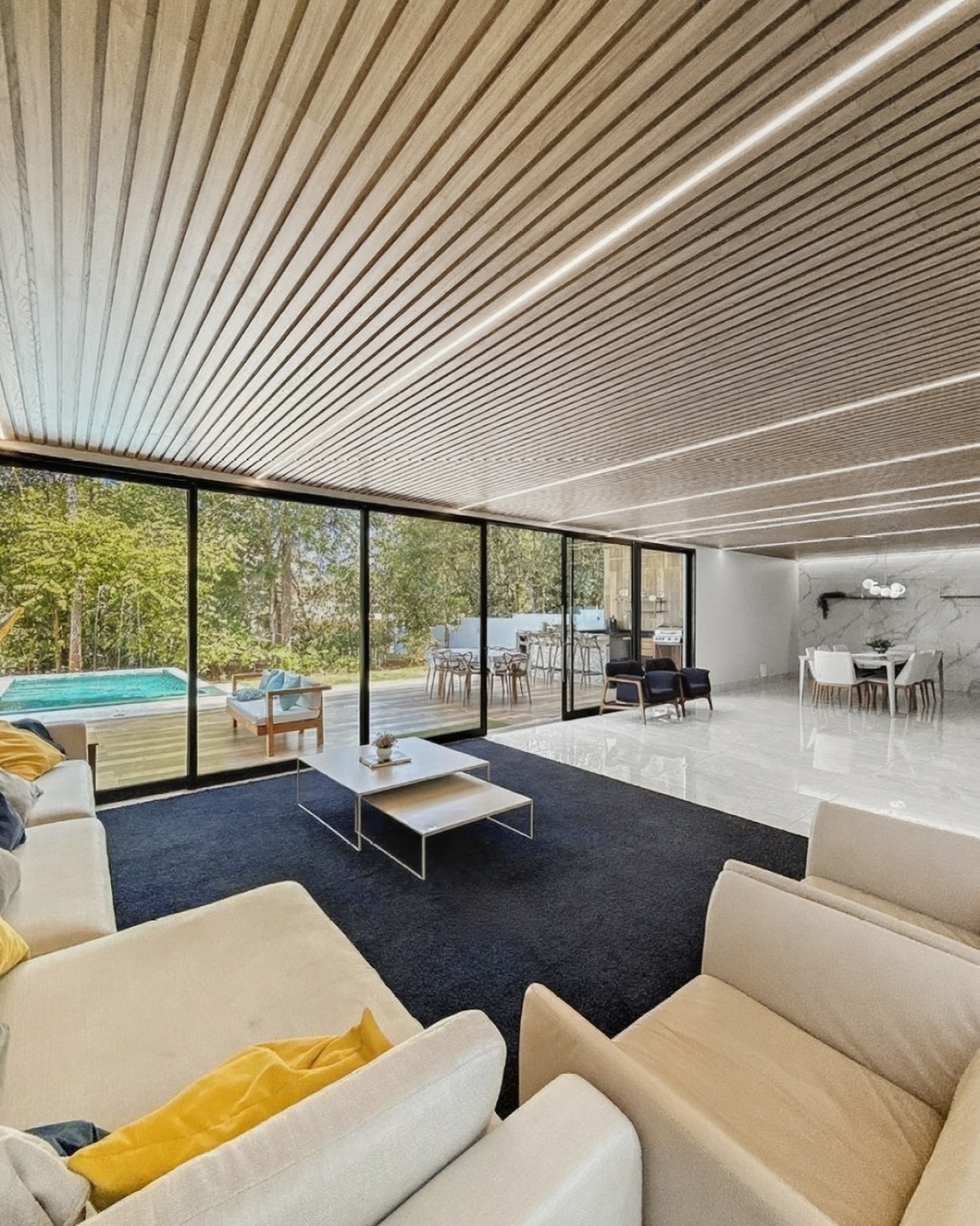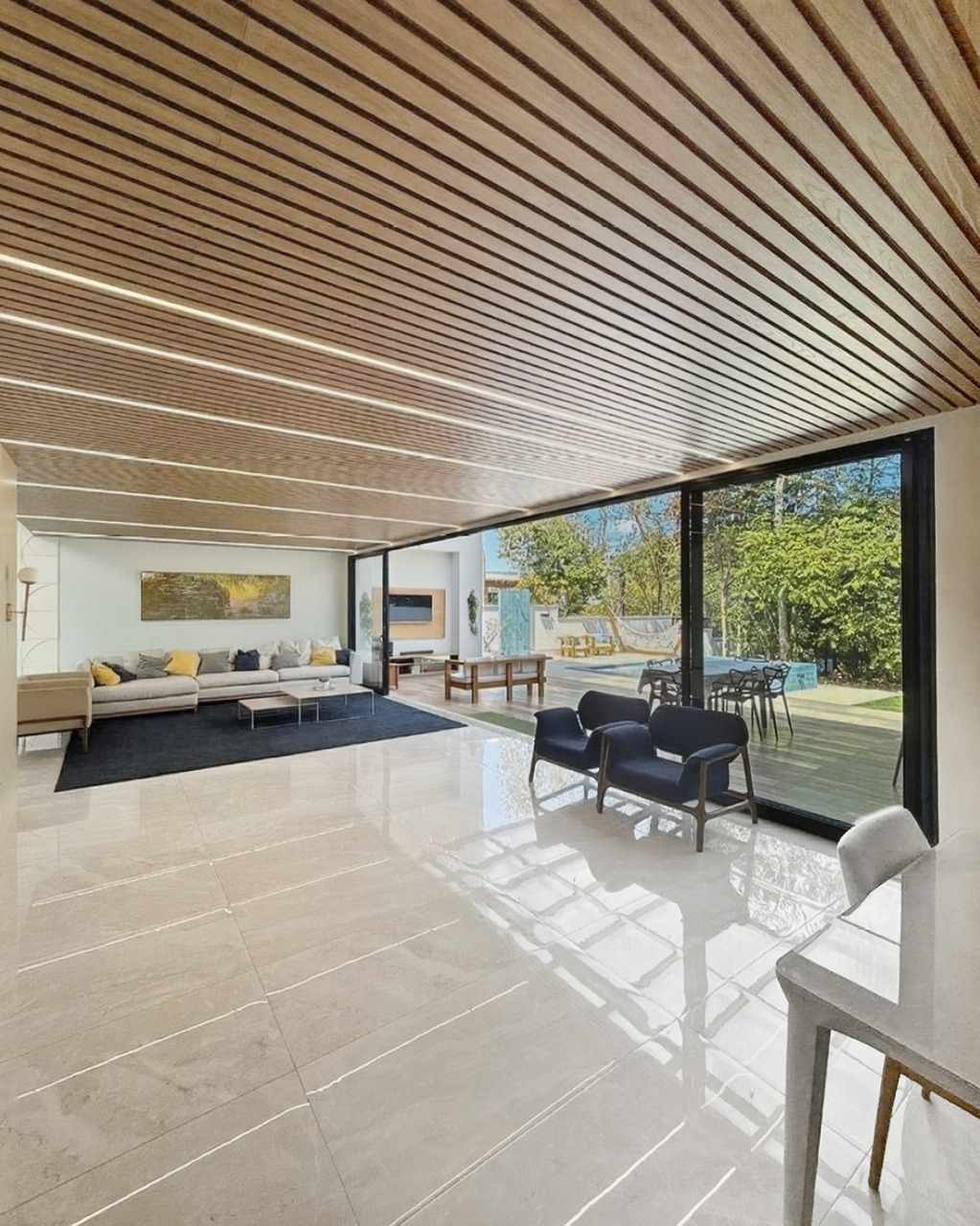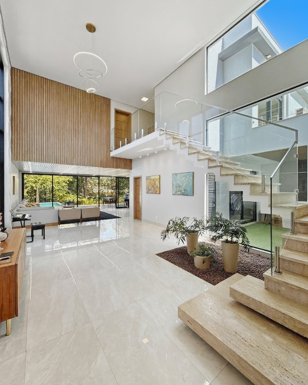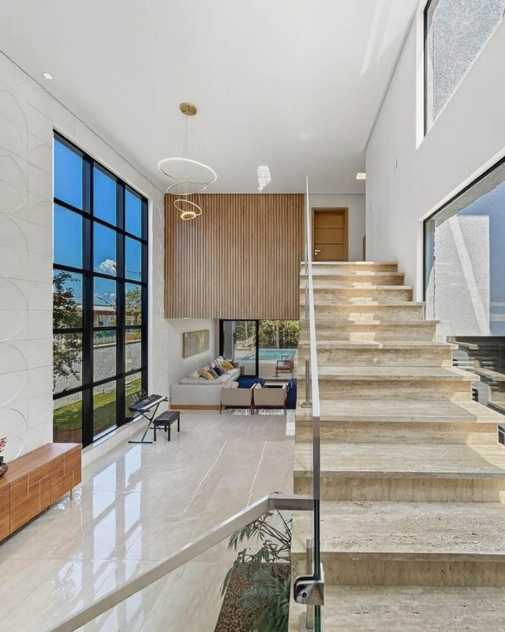 O living com pé-direito alto e grandes esquadrias de vidro maximiza a entrada de luz natural e ventilação. A arquitetura foi pensada para eliminar barreiras: a sala de estar conecta-se fluidamente à varanda e à área gourmet, criando um espaço amplo para receber.
